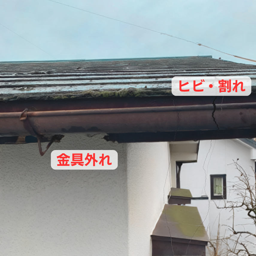 | 樋がたわんでいる・外れている | 金具の緩み、強風の影響、経年劣化 |
